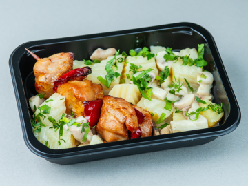 Cartofi cu ciuperci și frigărui de pui